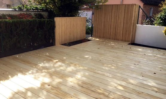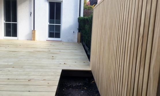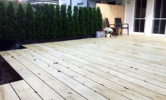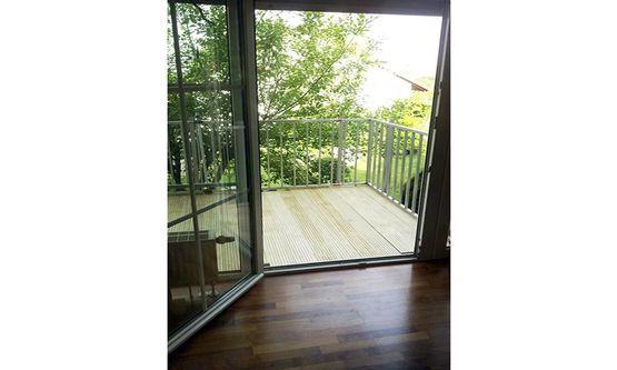 Ziegeln im südländischen Stil. Terrassenbelag aus Lapacho Holz mit unsichtbarer Befestigung. Teakholzparkett im Spa-Bereich und in den Schlafräumen. Balkon und Terrassenüberdachung als Erweiterung hergestellt. Die Sanierung wurde komplett ohne Architekten